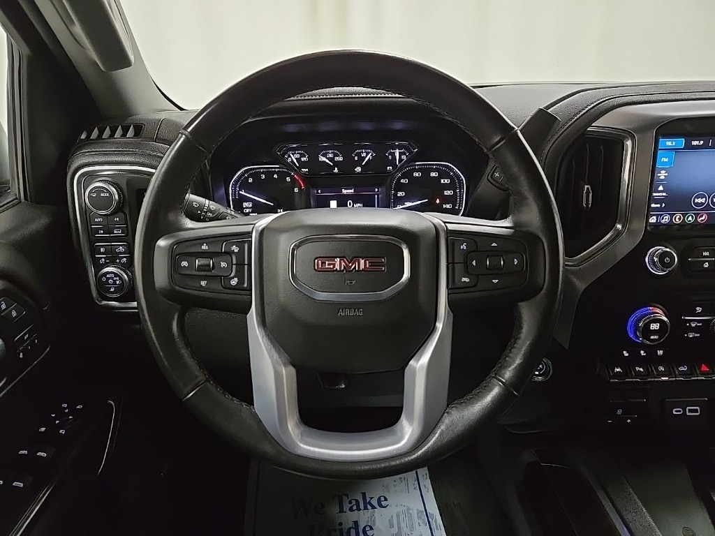 Onyx Black 2021 GMC Sierra 1500 SLT 4WD 10-Speed Automatic 3.0L I6 Ford Blue Advantage: Blue Certified Certified, 10-Speed Automatic, 4WD, Jet Black Leather, 10-Way Power Driver Seat Adjuster w/Lumbar, 10-Way Power Passenger Seat Adjuster w/Lumbar, 12-Volt Rear Auxiliary Power Outlet, 120-Volt Bed Mounted Power Outlet, 120-Volt Instrument Panel Power Outlet, 170 Amp Alternator, 2 USB Ports, 2 USB Ports (1st Row), 20" x 9" Polished Aluminum Wheels, 220 Amp Alternator, 3.23 Rear Axle Ratio, 4-Wheel Disc Brakes, 4G LTE Wi-Fi Hotspot Capable, 6 Speakers, 6-Speaker Audio System Feature, ABS brakes, Adaptive Cruise Control, Air Conditioning, All-Weather Floor Liner (LPO), Alloy wheels, AM/FM radio: SiriusXM with 360L, Apple CarPlay/Android Auto, Auto-dimming door mirrors, Auto-dimming Rear-View mirror, Auto-Locking Rear Differential, Automatic Emergency Braking, Automatic temperature control, Auxiliary External Transmission Oil Cooler, Brake assist, Bumpers: chrome, Chrome Grille, Chrome Wheel To Wheel Assist Steps, Color-Keyed Carpeting Floor Covering, Compass, Deep-Tinted Glass, Delay-off headlights, Driver Alert Package I, Driver Alert Package II, Driver door bin, Driver Memory, Driver vanity mirror, Dual front impact airbags, Dual front side impact airbags, Electric Rear-Window Defogger, Electrical Lock Control Steering Column, Electronic Stability Control, Engine Block Heater, Floor-Mounted Center Console, Following Distance Indicator, Forward Collision Alert, Front 40/20/40 Split-Bench Seat, Front anti-roll bar, Front Bucket Seats, Front Center Armrest w/Storage, Front dual zone A/C, Front fog lights, Front Frame-Mounted Black Recovery Hooks, Front Pedestrian Braking, Front reading lights, Front wheel independent suspension, Fully automatic headlights, GMC Connected Access Capable, Heated 2nd Row Outboard Seats, Heated door mirrors, Heated Driver & Front Outboard Passenger Seating, Heated front seats, Heated steering wheel, Heavy Duty Suspension, Hitch Guidance, Hitch Guidance w/Hitch View, Illuminated entry, In-Vehicle Trailering App, Integrated Trailer Brake Controller, IntelliBeam Automatic High Beam On/Off, Keyless Open & Start, Lane Change Alert w/Side Blind Zone Alert, Lane Keep Assist w/Lane Departure Warning, LED Cargo Area Lighting, Low tire pressure warning, Manual Tilt-Wheel & Telescoping Steering Column, Memory seat, Occupant sensing airbag, OnStar & GMC Connected Services Capable, Outside temperature display, Overhead airbag, Overhead console, Panic alarm, Passenger door bin, Passenger vanity mirror, Perf Leather-Appointed Front Outboard Seat Trim, Perimeter Lighting, Power Door Locks, Power door mirrors, Power driver seat, Power Front Passenger Windows w/Express Up/Down, Power Front Windows w/Driver Express Up/Down, Power passenger seat, Power Rear Windows w/Express Down, Power Sliding Rear Window w/Rear Defogger, Power steering, Power windows, Preferred Equipment Group 4SA, Premium audio system: GMC Infotainment System, Premium Bose 7-Speaker Sound System, ProGrade Trailering System, Radio data system, Radio: Premium GMC Infotainment Sys w/Multi-Touch, Radio: Premium GMC Infotainment Sys w/Navigation, Rear Cross Traffic Alert, Rear Dual USB Charging-Only Ports, Rear reading lights, Rear seat center armrest, Rear step bumper, Rear Wheelhouse Liners, Rear window defroster, Re