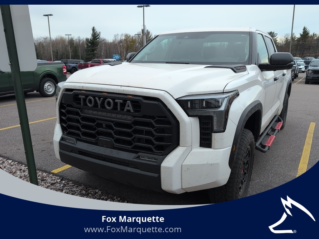 Ice Cap 2023 Toyota Tundra Hybrid TRD Pro 4WD 10-Speed Automatic 3.4L V6 Ford Blue Advantage: Blue Certified Certified, 3.4L V6, 400W/120V AC Rear Seat & Bed Power Supply, Black Dual Exhaust Tips w/Debossed TRD Pro Logo, Front & Rear Mud Guards, Heated Color-Keyed Outside Mirrors, Heated Power Sideview Mirrors w/LED Turn Signals, LED Lightbar w/Fog & Marker Lights, Multi-Terrain Back Monitor, Navigation System, Panoramic View Back Monitor, Power Panoramic Roof, Qi-Compatible Wireless Smartphone Charger, Smoked-Finish Premium LED Headlights & DRL, Towing Technology Package, TRD Pro Heated Leather-Trimmed Steering Wheel, TRD Pro Package, TRD Pro Tow Package, 12 Speakers, 3.31 Axle Ratio, 4-Wheel Disc Brakes, ABS brakes, Air Conditioning, Alloy wheels, AM/FM radio: SiriusXM, Apple CarPlay/Android Auto, Auto High-beam Headlights, Auto-dimming door mirrors, Auto-dimming Rear-View mirror, Automatic temperature control, Brake assist, Bumpers: body-color, Delay-off headlights, Driver door bin, Driver vanity mirror, Dual front impact airbags, Dual front side impact airbags, Electronic Stability Control, Emergency communication system: Safety Connect (10-year trial), Front anti-roll bar, Front Bucket Seats, Front Center Armrest, Front dual zone A/C, Front fog lights, Front reading lights, Front wheel independent suspension, Fully automatic headlights, Garage door transmitter: HomeLink, Heated & Ventilated Front Bucket Seats, Heated door mirrors, Heated front seats, Heated steering wheel, Illuminated entry, Knee airbag, Leather Shift Knob, Low tire pressure warning, Memory seat, Occupant sensing airbag, Outside temperature display, Overhead airbag, Overhead console, Panic alarm, Passenger door bin, Passenger vanity mirror, Power door mirrors, Power driver seat, Power moonroof, Power passenger seat, Power steering, Power windows, Radio data system, Radio: Premium Audio w/JBL, Rear reading lights, Rear seat center armrest, Rear step bumper, Rear window defroster, Remote keyless entry, Security system, SofTex Seat Trim, Speed control, Speed-sensing steering, Split folding rear seat, Sport steering wheel, Steering wheel mounted audio controls, Tachometer, Telescoping steering wheel, Tilt steering wheel, Traction control, Trip computer, Turn signal indicator mirrors, Variably intermittent wipers, Ventilated front seats, Voltmeter, Wheels: 18" x 8" Black BBS Forged Aluminum, 3.4L V6, 400W/120V AC Rear Seat & Bed Power Supply, Black Dual Exhaust Tips w/Debossed TRD Pro Logo, Front & Rear Mud Guards, Heated Color-Keyed Outside Mirrors, Heated Power Sideview Mirrors w/LED Turn Signals, LED Lightbar w/Fog & Marker Lights, Multi-Terrain Back Monitor, Navigation System, Panoramic View Back Monitor, Power Panoramic Roof, Qi-Compatible Wireless Smartphone Charger, Smoked-Finish Premium LED Headlights & DRL, Towing Technology Package, TRD Pro Heated Leather-Trimmed Steering Wheel, TRD Pro Package, TRD Pro Tow Package.
