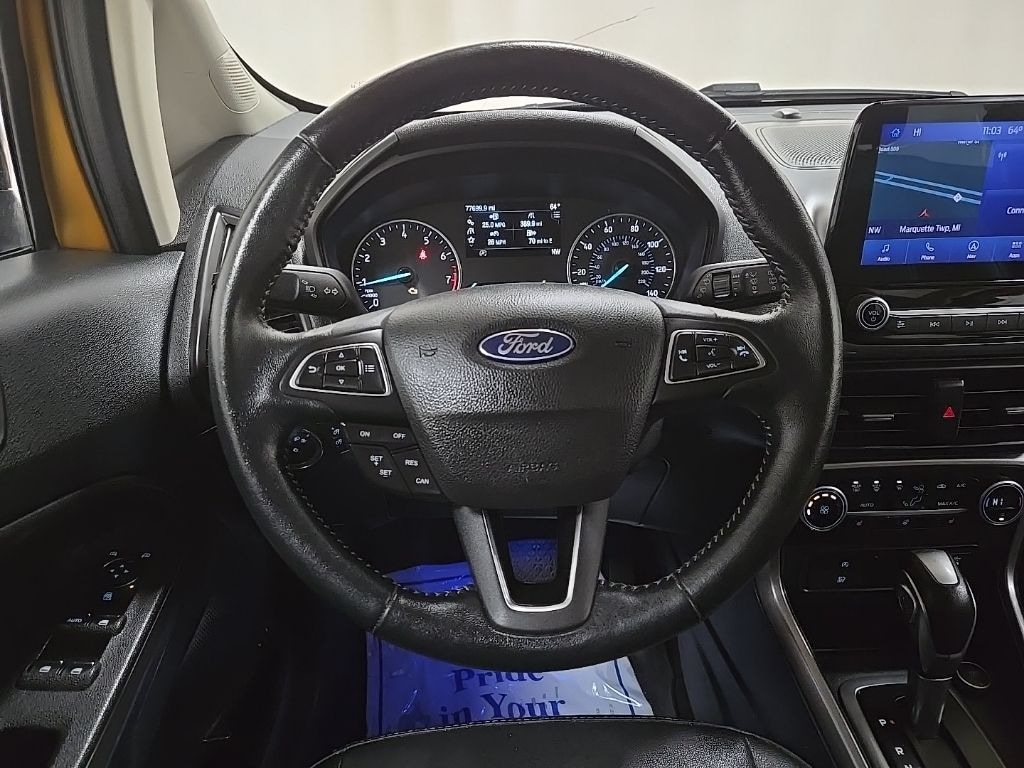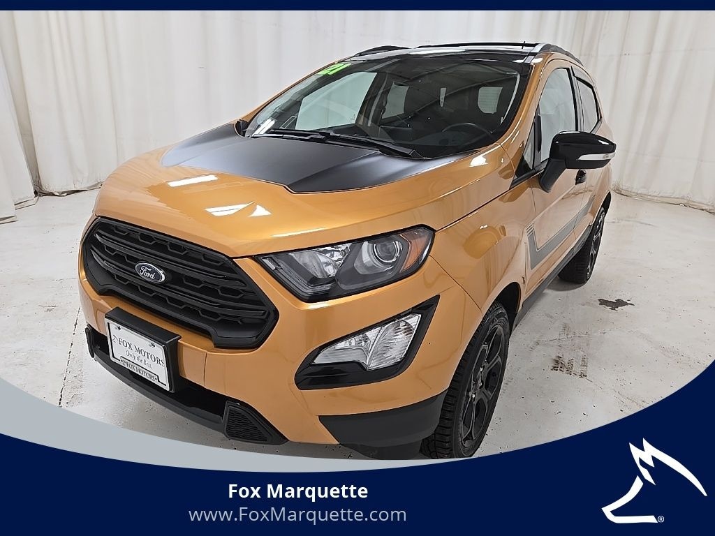 Luxe Yellow 2021 Ford EcoSport SES 4WD 6-Speed Automatic 2.0L I4 Ti-VCT GDI 3.51 Axle Ratio, 4-Wheel Disc Brakes, 7 Speakers, ABS brakes, ActiveX Seating Material Heated Front Bucket Seats, Air Conditioning, Alloy wheels, AM/FM radio: SiriusXM, AppLink/Apple CarPlay and Android Auto, Auto-dimming Rear-View mirror, Automatic temperature control, Brake assist, Bumpers: body-color, Cargo Mat, Compass, Delay-off headlights, Driver door bin, Driver vanity mirror, Dual front impact airbags, Dual front side impact airbags, Electronic Stability Control, Emergency communication system: SYNC 3 911 Assist, Engine Block Heater, Equipment Group 300A, Exterior Parking Camera Rear, Front & Rear Floor Liners, Front anti-roll bar, Front Bucket Seats, Front Center Armrest, Front fog lights, Front reading lights, Front wheel independent suspension, Fully automatic headlights, Heated door mirrors, Heated front seats, Heated steering wheel, Hood/Side/Tailgate Overlander Decal, Illuminated entry, Interior Protection Package, Knee airbag, Leather Shift Knob, Low tire pressure warning, Navigation System, Occupant sensing airbag, Outside temperature display, Overhead airbag, Overhead console, Panic alarm, Passenger door bin, Passenger vanity mirror, Power door mirrors, Power driver seat, Power moonroof, Power steering, Power windows, Radio data system, Radio: AM/FM/MP3 Stereo, Rain sensing wipers, Rear anti-roll bar, Rear Parking Sensors, Rear seat center armrest, Rear side impact airbag, Rear window defroster, Rear window wiper, Remote keyless entry, Roof rack: rails only, SiriusXM Radio, SiriusXM Traffic & Travel Link, Speed control, Speed-sensing steering, Split folding rear seat, Spoiler, Steering wheel mounted audio controls, SYNC 3 Communications & Entertainment System, Tachometer, Telescoping steering wheel, Tilt steering wheel, Traction control, Trip computer, Turn signal indicator mirrors, Variably intermittent wipers, Wheels: 17" Black-Painted Aluminum.